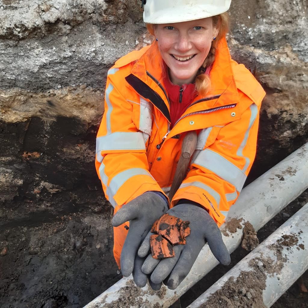 De scherven zijn gevonden in een laag grond die uit de middeleeuwen stamt. Het kommetje is gemaakt van terra sigillata, een soort rood/bruin aardewerk dat door de Romeinen werd gebruikt.
