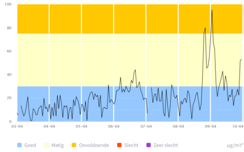 Uit gegevens van Luchtmeetnet, die een meetapparaat bij de Europaweg hebben, bleek dat om 21.00 uur er 22.35 µg/m³ fijnstof werd gemeten. Dat was op dat moment binnen de perken. Om 23.00 uur was de hoeveelheid fijnstof toegenomen naar 53.07 µg/m³. Dit betekent een matige situatie. De verwachting is dat de hoeveelheid fijnstof de komende uren zal stabiliseren en daarna weer zal afnemen naar normale waarden.