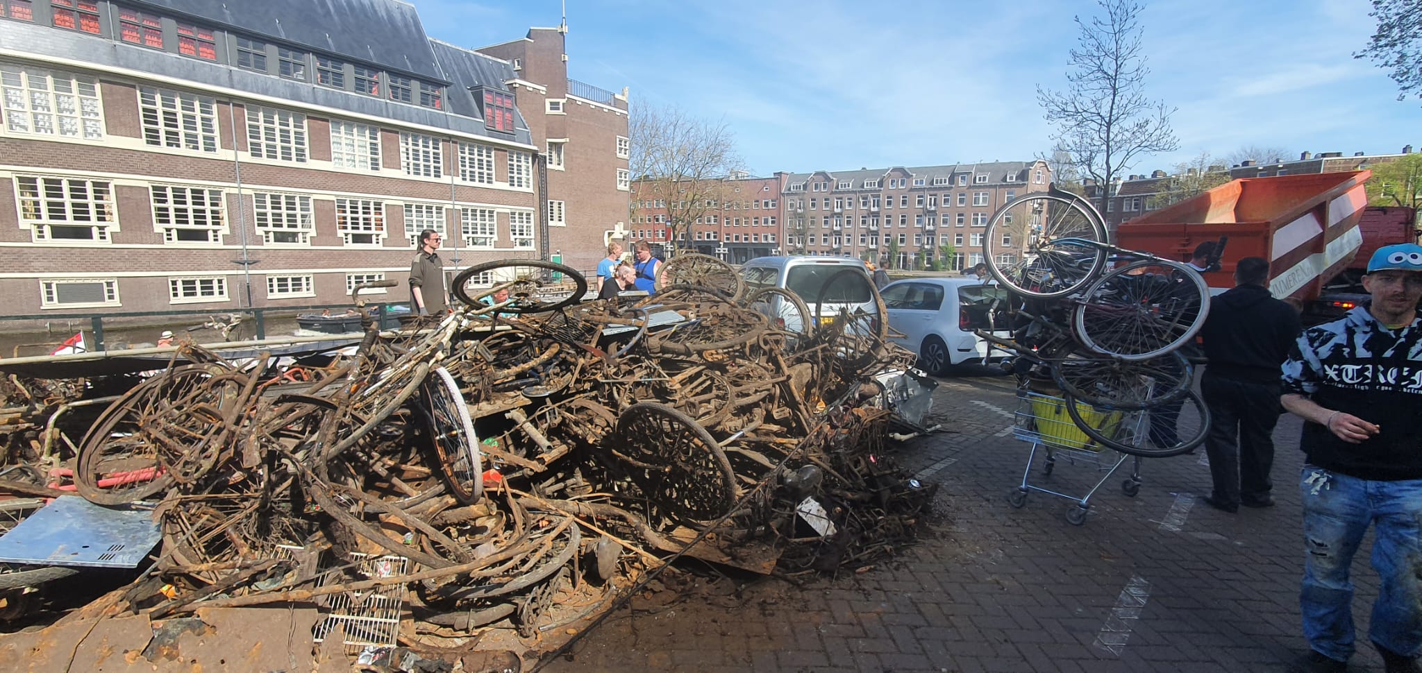 En er werd van alles van de bodem gehaald: “Zo’n veertig tot vijftig fietsen. Ook veel fietswrakken en zwaar ijzer. We hebben een Felyx-scooter gevonden, een stuk of zeven dranghekken en verschillende accu’s van elektrische fietsen. Al die materialen hebben we in een container gestopt. Ik had van tevoren contact gezocht met SimmereN. Dat is een bekend metaalrecycling bedrijf aan de Winschoterweg in Groningen. Zij hadden speciaal voor deze dag een vrachtwagen met container naar Amsterdam gestuurd. Met de chauffeur hadden we afgesproken dat hij hier om 16.00 uur zou zijn, en hij was hier ook precies op dat tijdstip. Alle spullen gaan nu naar Groningen en daar wordt geïnventariseerd hoeveel geld we hier mee verdiend hebben.”
