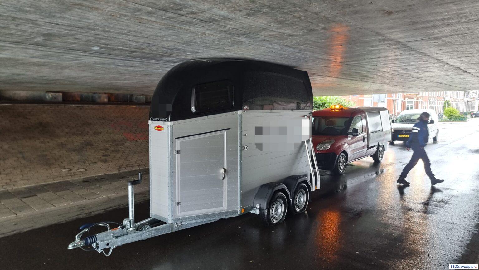 Een paardentrailer kwam woensdagmorgen klem te zitten onder de tunnel bij de Oosterhavenbrug. Dat meldt de website 112groningen.