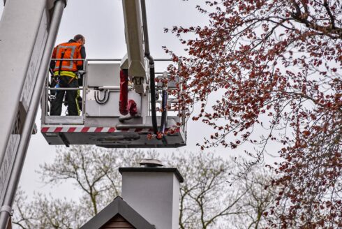 Met behulp van de hoogwerker is met behulp van een ramoneur het schoorsteenkanaal geveegd. Vanwege de brand was de weg deels afgesloten.
