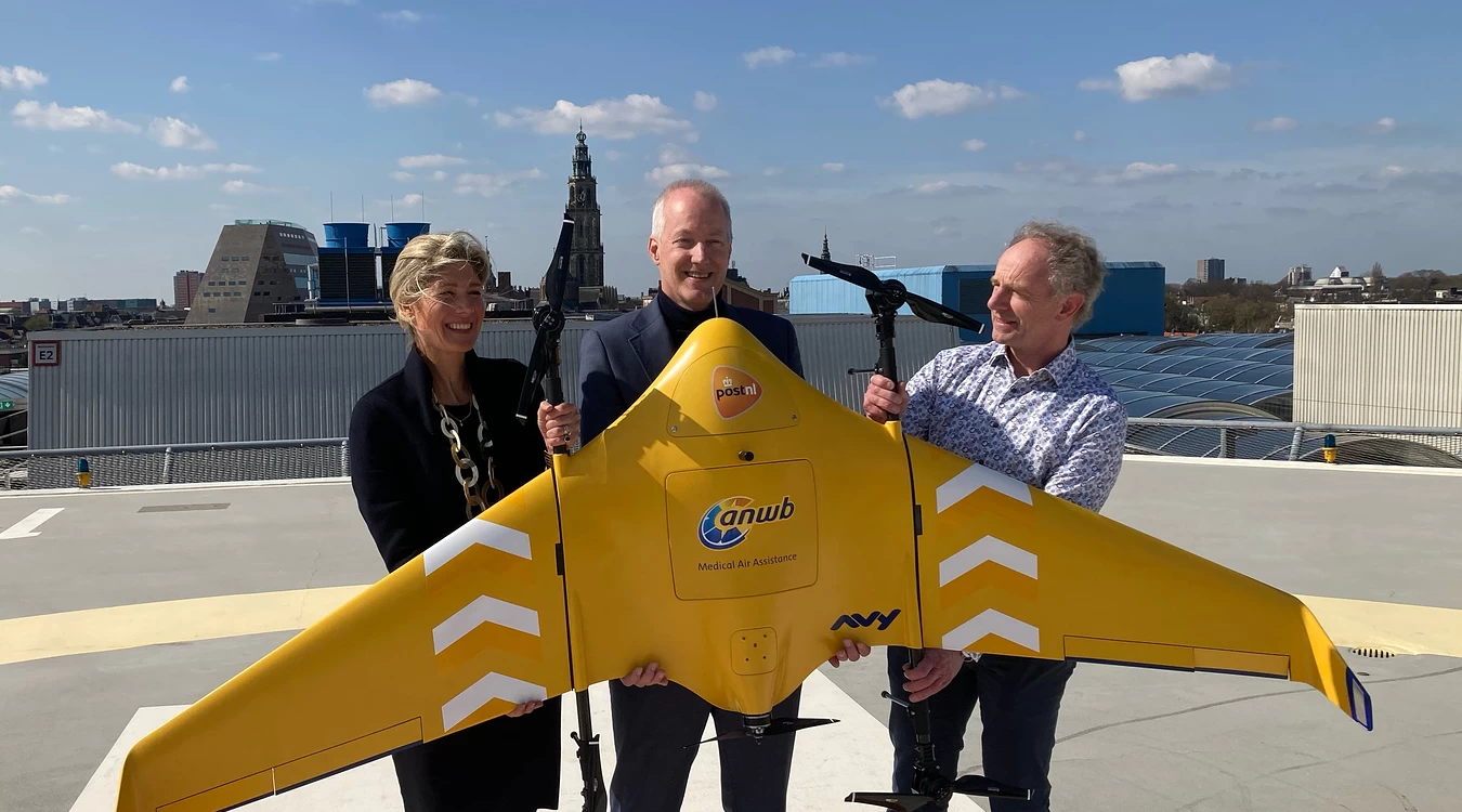 Van links naar rechts: RvB-lid Stephanie Klein Nagelvoort, Martin ter Haar en Richard Jacobs (apotheek) met medische drone - Bron: UMCG