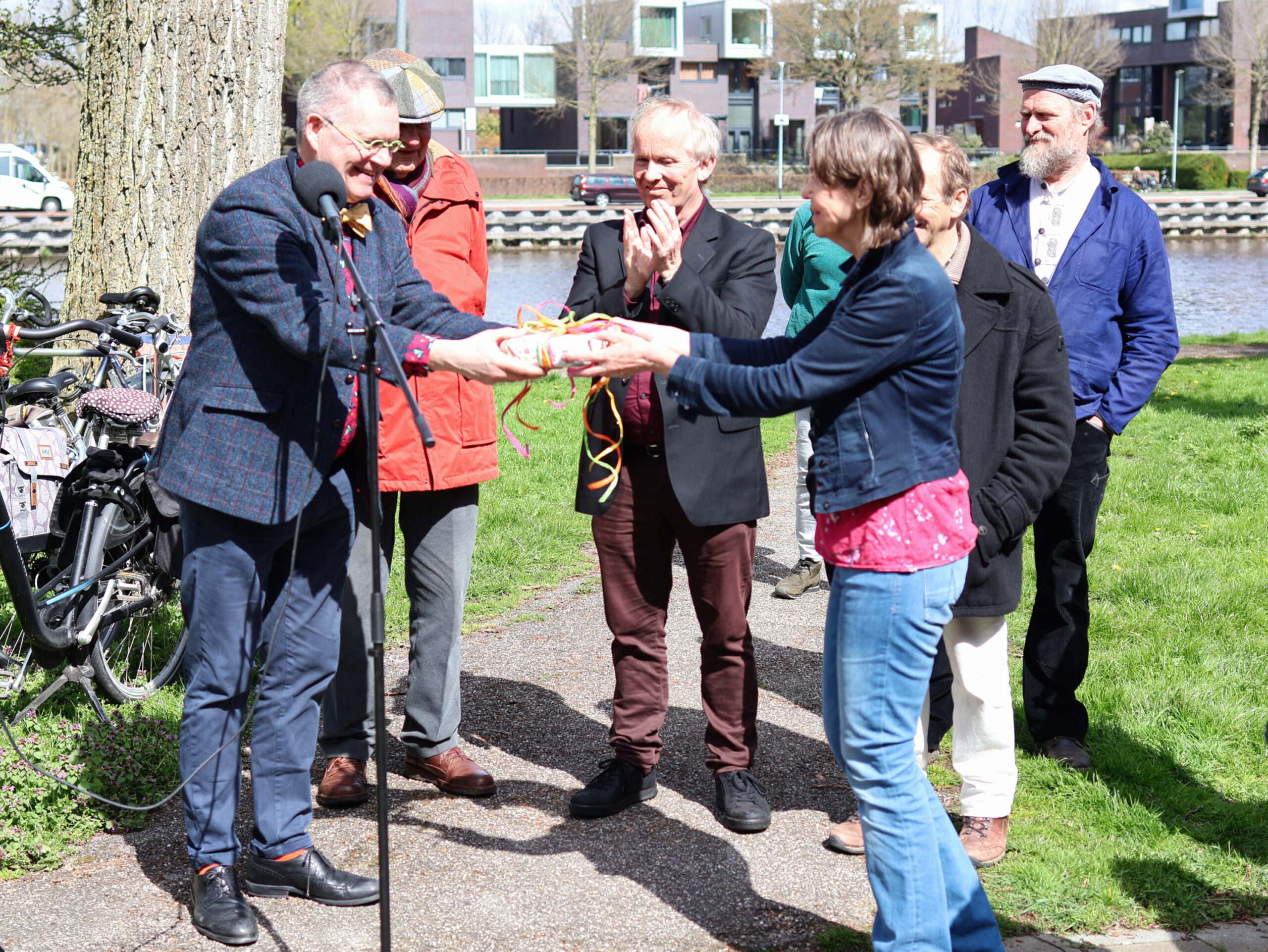 De overhandiging van het wandelboekje. Foto: Wendy Bruins