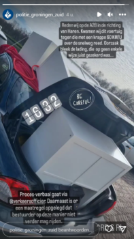 “Wij reden op de A28 richting Haren toen we een voertuig tegen kwamen die ongeveer zestig kilometer per uur reed”, schrijft de politie. “Oorzaak van de lage snelheid bleek de lading te zijn. Deze lading bleek ook op geen enkele manier gezekerd te zijn.” Op een foto die de politie deelt is een geopende kofferbak te zien waar een kast uitsteekt. Ook op het dak van het voertuig liggen verschillende kastonderdelen.