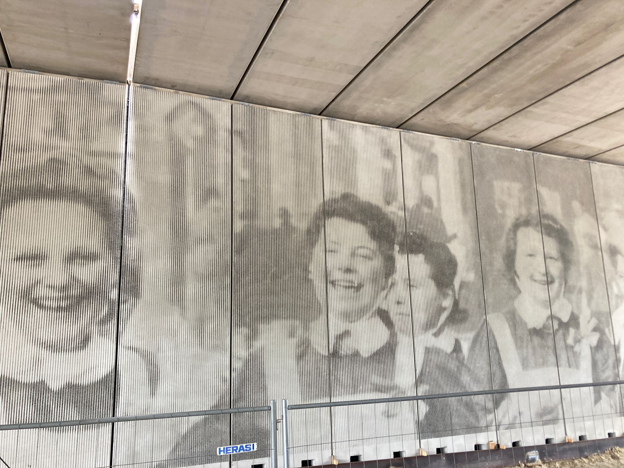 De foto is geprint in het beton van het viaduct aan de Paterswoldseweg, onder de zuidelijke ringweg. Het kunstwerk van Syb van Breda werd woensdag onthuld. Op de afbeelding staan de verpleegsters van het Diakonessenhuis aan de Praediniussingel, die in april 1945 de Canadese bevrijders onthaalden.