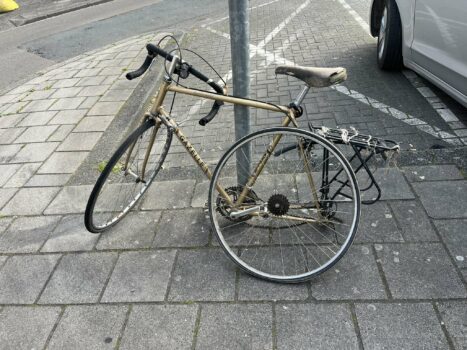“Ik heb de auto op de Kiss&Ride geparkeerd en ben daar gaan zoeken. Onvindbaar natuurlijk. In het Stadsbalkon raakte ik aan de praat met wat mannen van de gemeente. Ik vertelde hun het verhaal. De meneer zei, wat vreemd. Het Forum heeft toch een bewaakte fietsenstalling? Vervolgens vroeg hij om wat voor fiets het ging. Ik het verhaal vertellen. En hij: die heb ik gezien. Die staat tegen de gevel hier. Er is melding gemaakt dat het rijwiel opgehaald moet worden. Wij naar de plek, en daar stond de fiets. Wel flink beschadigd. De derailleur is kapot, en het achterwiel is stuk. Maar ik was zo blij. Hoe blij kun je zijn met een kapotte fiets hè?”
