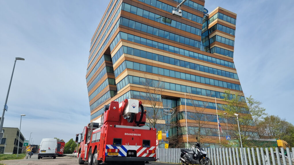 De brandweer wilde het duo uit het bakje halen, maar de hoogwerker kon er niet bij. De hoogwerker van de brandweer komt niet verder dan 35 meter. De glazenwassers hangen op bijna vijftig meter. De brandweer is daarom vertrokken.
