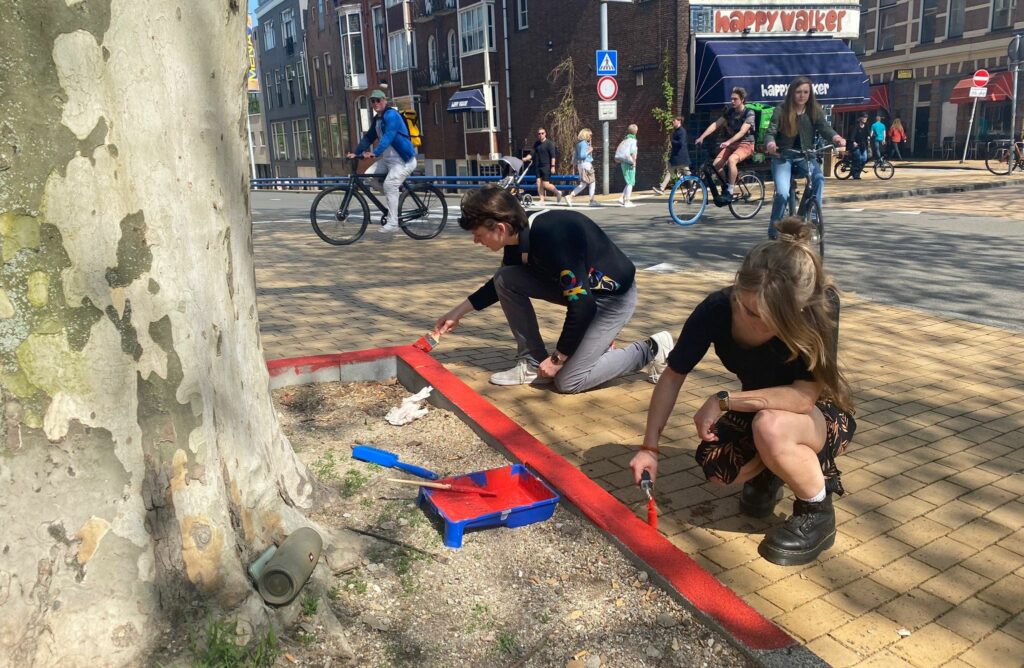 Cato en Teun van de Four Roses aan de Oosterstraat namen vrijdagmiddag de kwast ter hand. Met rode verf markeerden ze een vers gelegde stoeprand om een boom voor het Mexicaans-Amerikaanse restaurant. In het perkje gaat binnenkort een tweede tuintje verschijnen.