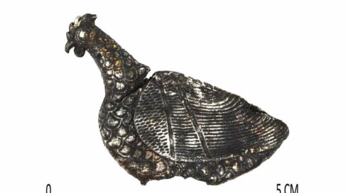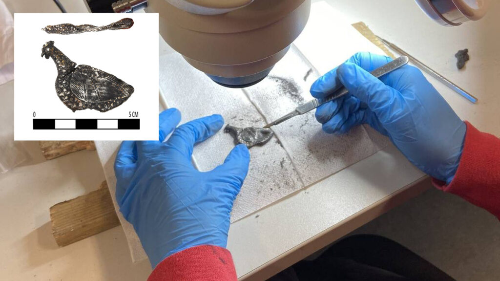 Vlak voor het einde van de werkweek dook op vrijdag nog een broche op uit de late middeleeuwen. De loodtinnen speld heeft volgens de archeologen een klauwvormige vatting en bevat een steentje. “Het werd vroeger ter versiering gedragen op de kleding”, besluit Koopstra. De archeoloog roemt collega Bas voor de vondst: “Knap speurwerk om zo’n vondst zonder metaaldetector te vinden!”