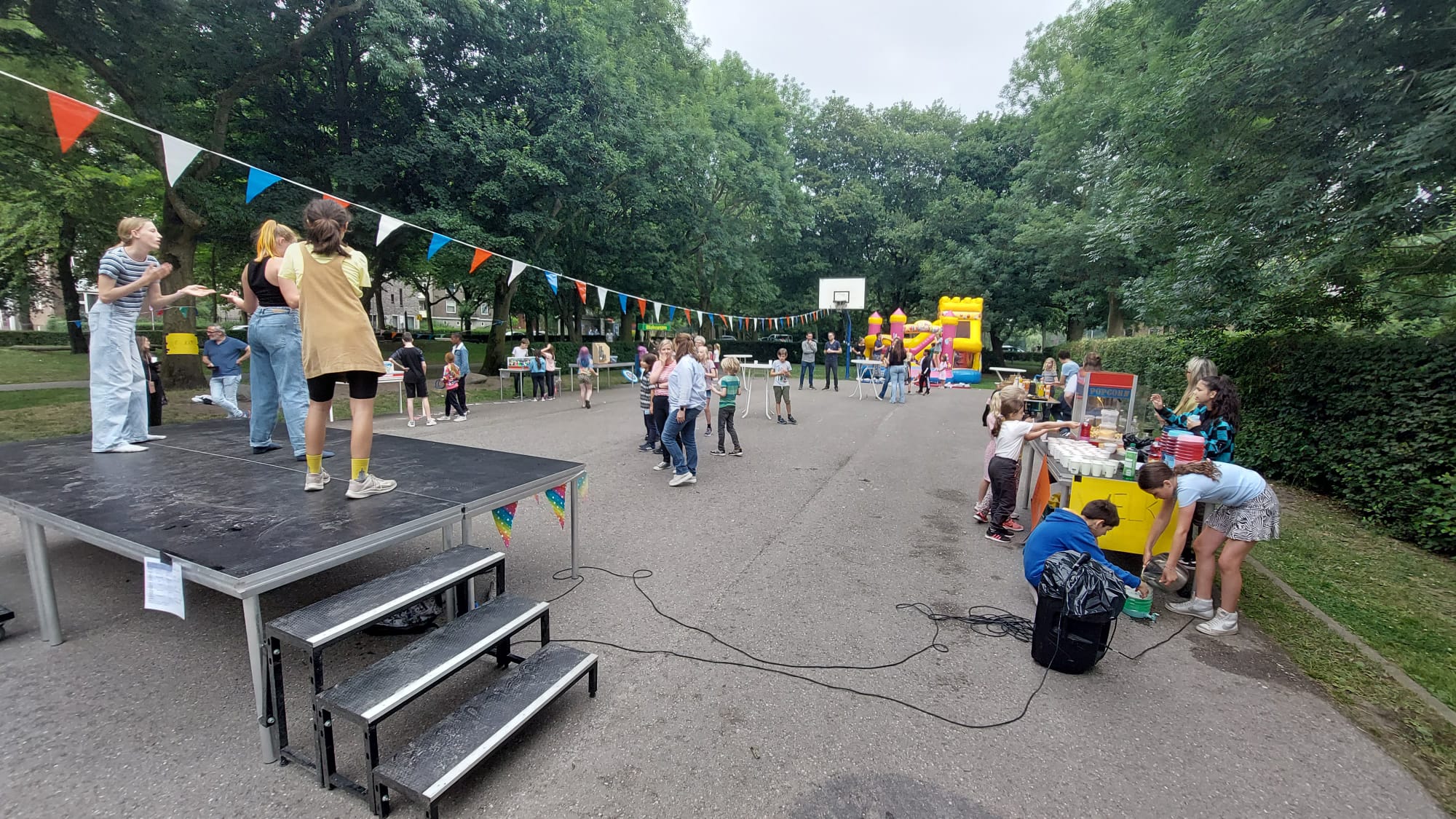Op het basketbalveld naast OBS Het Karrepad hebben leerlingen van groep 8C donderdag een feestje georganiseerd voor de buurt. Het thema heet Ontmoeting & Contact. Stichting Move en Pabo-studenten van NHL Stenden hebben meegeholpen met de organisatie.