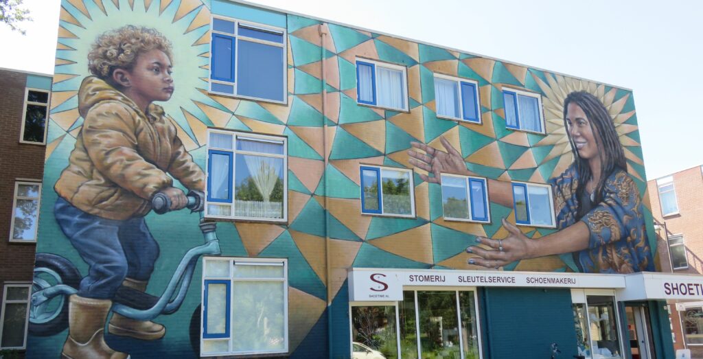 De ‘Muurschildering Moeder en kind’, gemaakt door straatkunstenaar Michel Velt, is de winnaar van de Kunst op Straatprijs 2023.