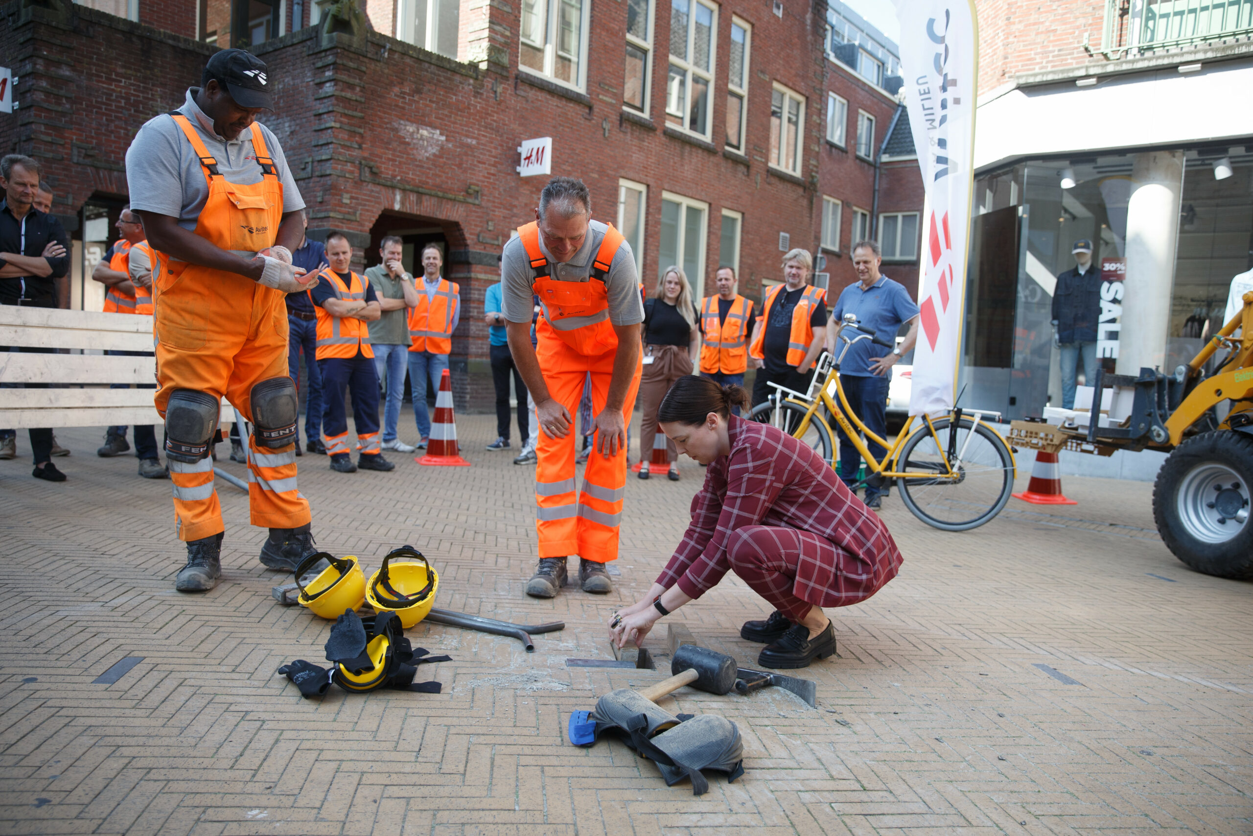 Met één laatste, nieuwe gele steen in het plaveisel is vrijdagochtend de vervanging van een groot deel van de gele stenen in de binnenstad afgesloten.