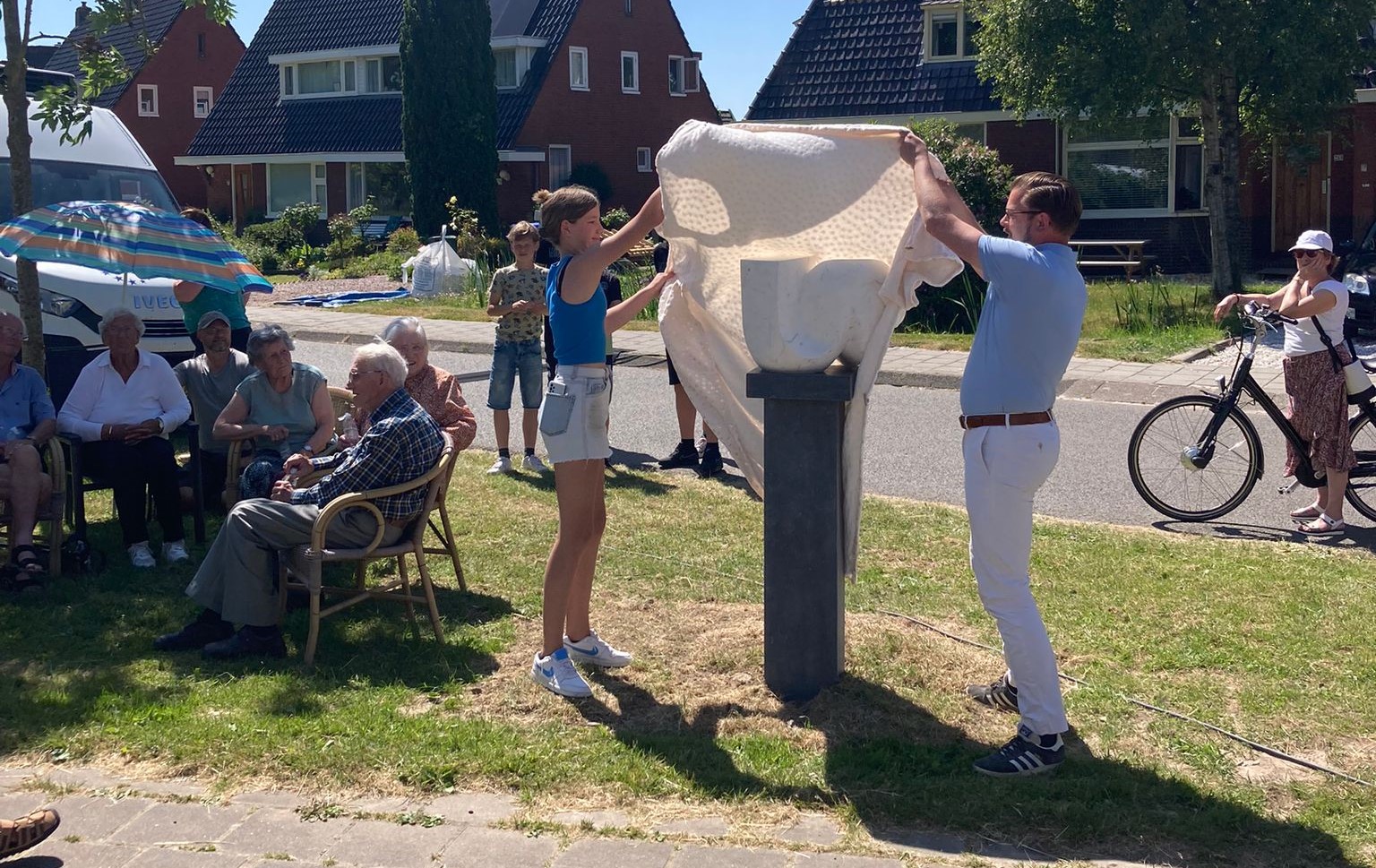 “Het is hier super gezellig”, vertelt Jorien Bakker van het Buurtcomité Peizerbocht. “Onze buurtburgemeester heeft bij de opening een toespraak gehouden. Daarna heeft één van de jongste bewoners samen met de wethouder een kunstwerk onthuld. Die onthulling was voor veel aanwezigen ook een grote verrassing.” Het kunstwerk is in 1967 gemaakt door Ad Molendijk voor de manifestatie ‘Beeld on route’. Het comité had behoefte aan een voorwerp dat de afronding van de werkzaamheden markeert, maar ook verbinding en ontmoeting symboliseert. Het kunstwerk van Molendijk werd aangetroffen in een opslag van de gemeente.