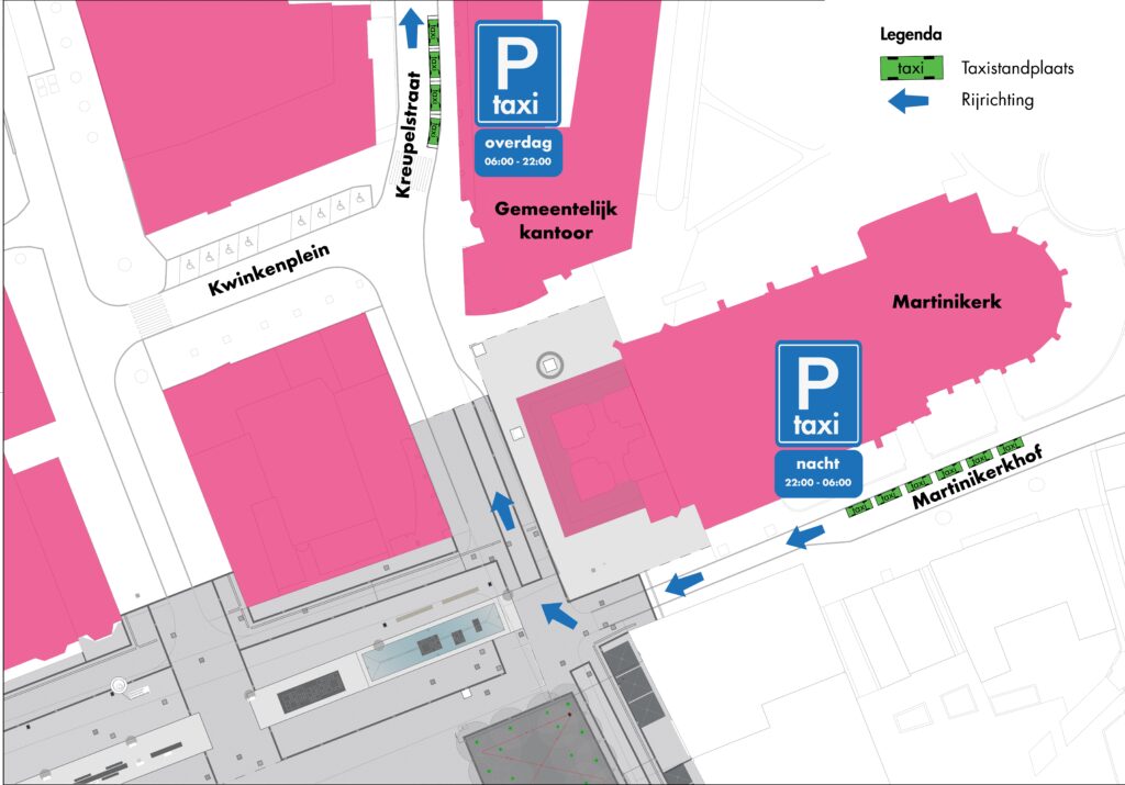 ’s Nachts staan taxi’s aan het Martinikerkhof, met de neus richting de Grote Markt. De taxi’s kunnen niet makkelijk keren in de straat, dus komt er een bord waarop staat dat passagiers de eerste taxi in de rij moeten gebruiken. Rechtdoor over de Grote Markt rijden is na 1 september helemaal niet meer aan de orde voor nachtelijke taxi’s, want dan gaat het gedeelte van de Grote Markt tussen de Martinitoren en het gebouw van ABN-AMRO op de schop. Dan moeten alle taxi’s dus keren op het Martinikerkhof.