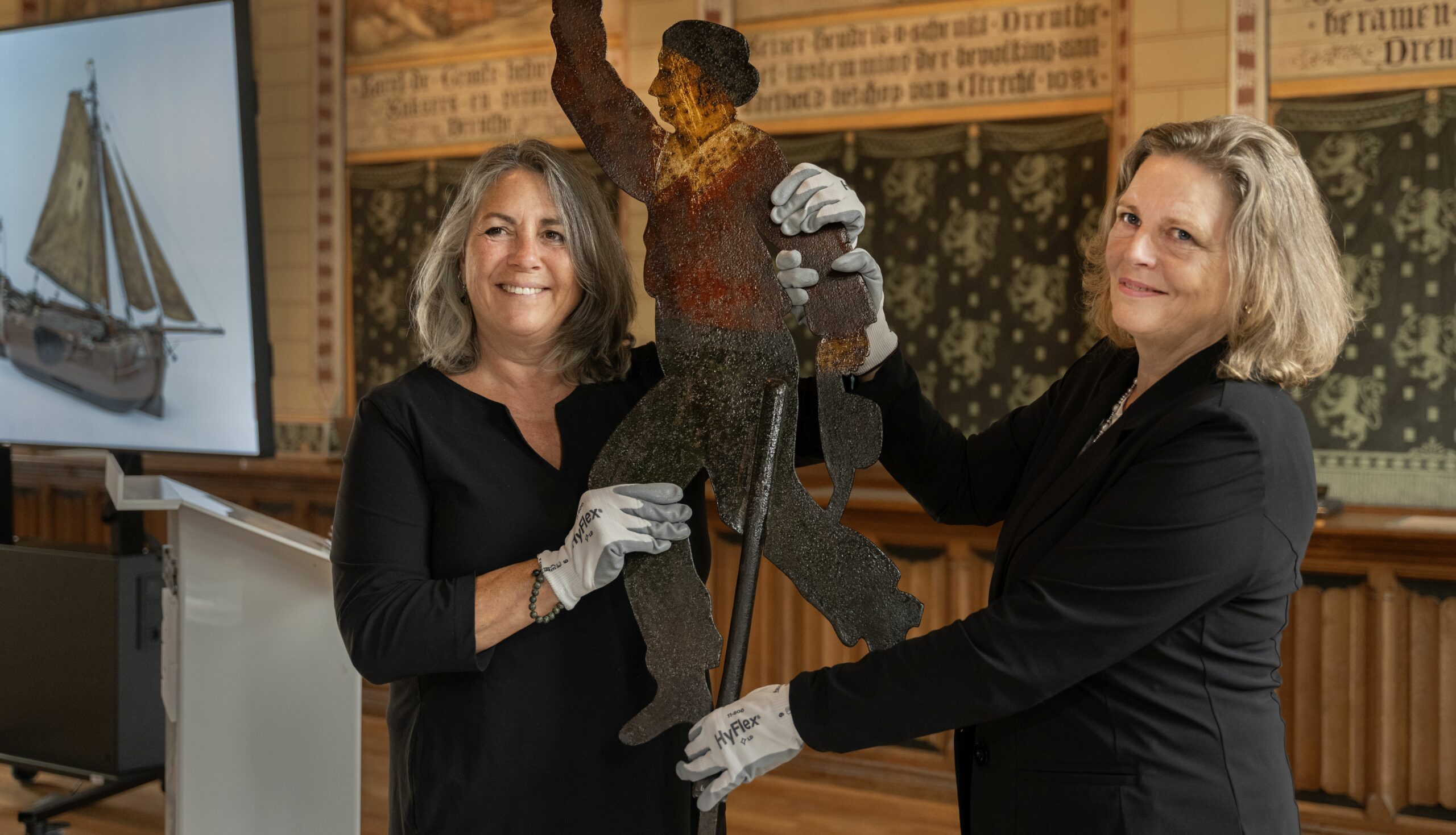 Directeur bestuurder Nicolette Bartelink van Museum aan de A gaf het houten mannetje op een stok aan zakelijk directeur Annelies Meuleman van het Drents Museum in Assen, de plek waar de Drentse maritieme objecten uit het Museum aan de A een nieuwe plek gaan krijgen.