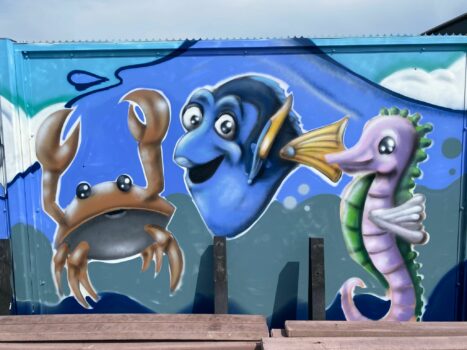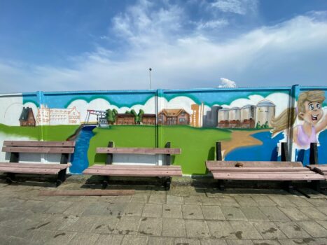 Het kunstwerk gaat uiteindelijk uit verschillende onderdelen bestaan. “Bij het kinderbad hebben we een jungle-thema. Dat hebben we gemaakt in samenwerking met de kinderen uit het dorp. Dat gaat over in een onderwaterwereld met bijvoorbeeld een octopus en haai. Via verschillende balsporten gaat het kunstwerk over in de skyline van Hoogkerk. Onderdeel daarvan is bijvoorbeeld de silo van de suikerfabriek. Het geheel wordt heel mooi. Helaas hebben we vandaag niet alles afgekregen. De komende dagen gaan we verder, en we denken dat het komende week ook wel af komt.”