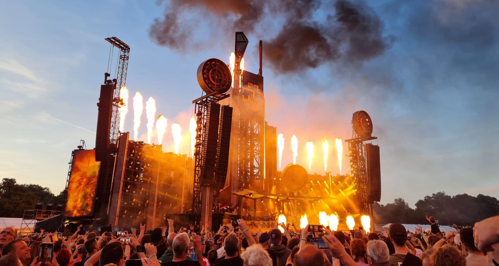 De vlammen van Rammstein stijgen ver boven het Stadspark uit.