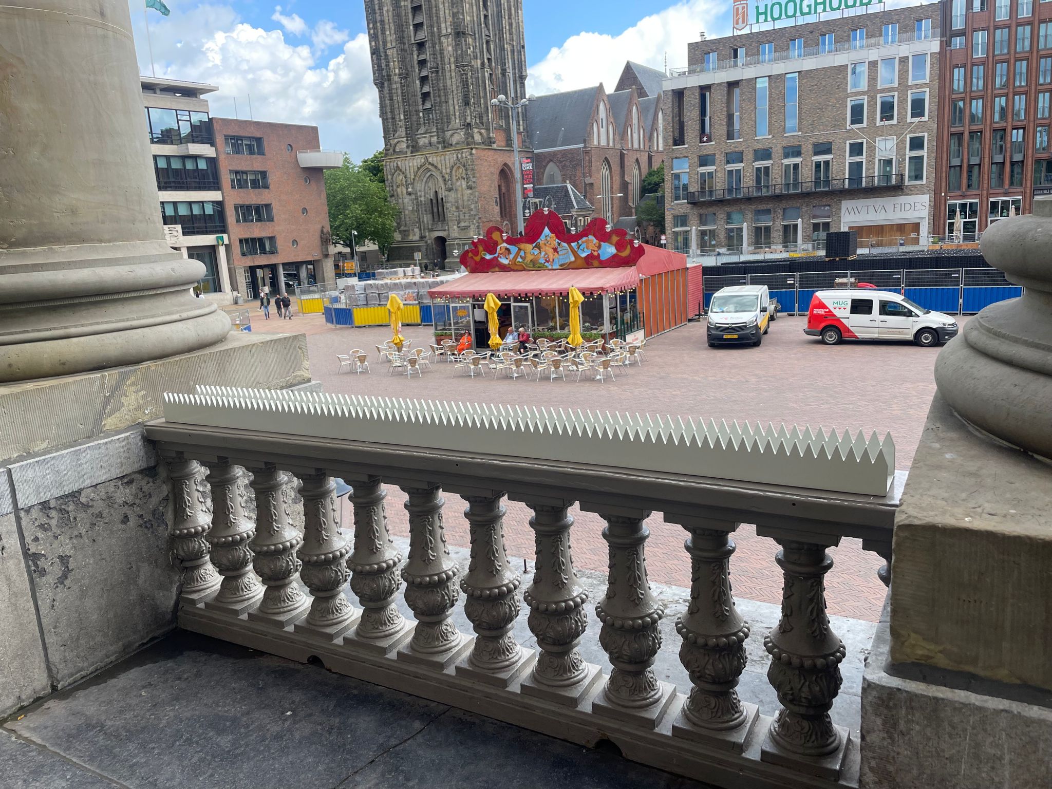 Het huis van de democratie in onze gemeente mag niet ontsierd worden door ‘vijandige architectuur’. Dat vindt de raadsfractie van Student en Stad. Nadat er eind mei al kritiek was op de metalen strips de ABN-AMRO aanbracht voor haar kantoor aan de Grote Markt, hekelt de partij nu de ontsierende ijzeren stekels voor de bordestrappen van het Stadhuis.