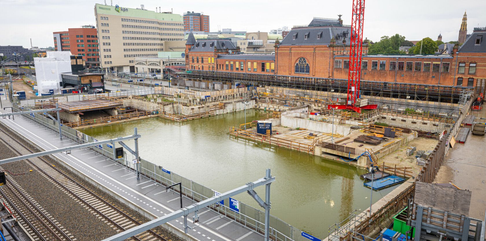 De bouwkuip pal achter het stationsgebouw staat sinds begin mei helemaal onder water, omdat er onderwaterbeton is gestort voor de vloer van de nieuwe voetgangerspassage en fietsenstalling die hier worden aangelegd. Dat is nu droog en daarom kan de ‘badkuip’ nu weer veranderen in een bouwkuip. Het opgepompte water wordt via leidingen afgevoerd naar het Noord-Willemskanaal.