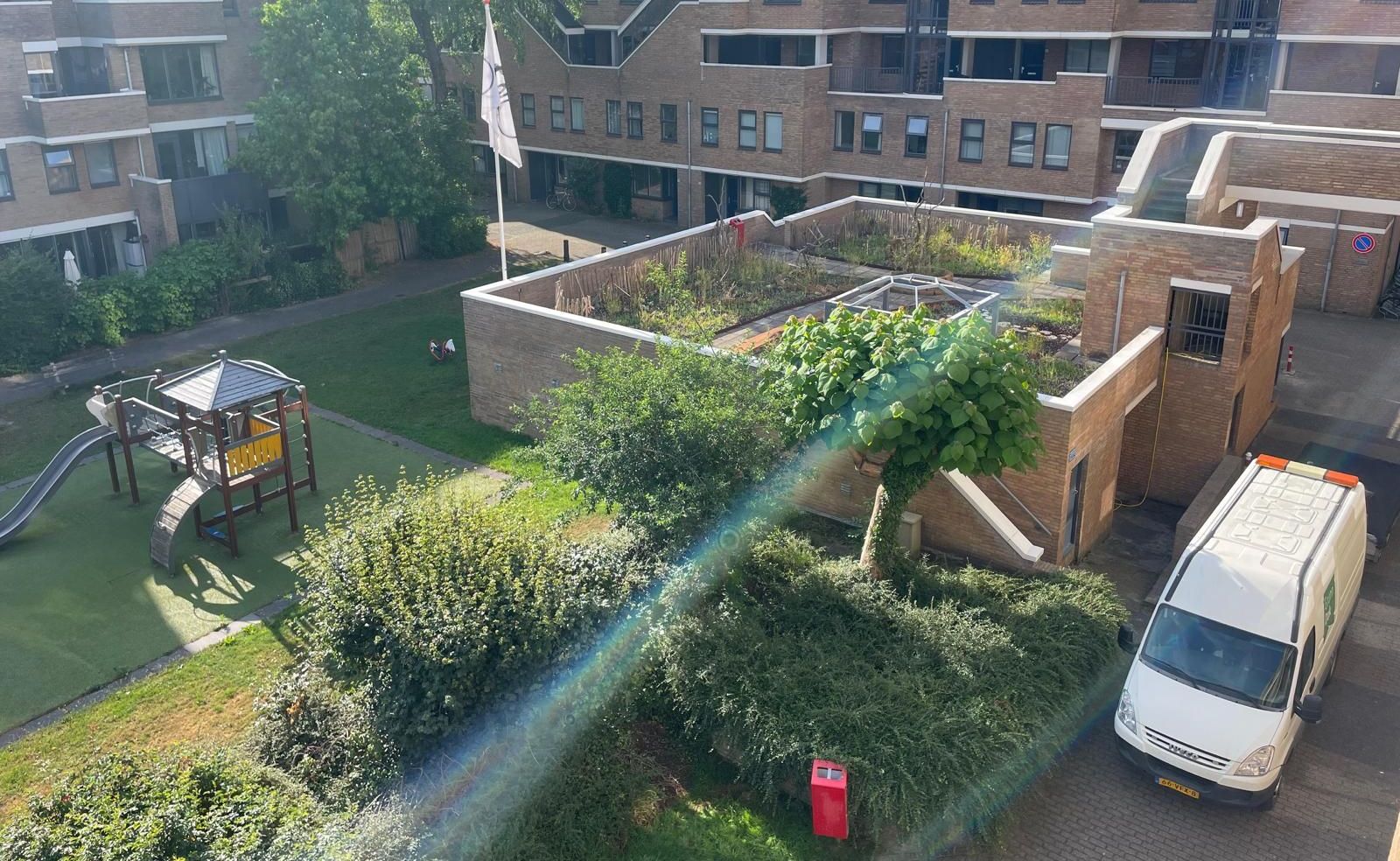 Afgelopen voorjaar is een daktuin aangelegd. De komende jaren zal de tuin vol groeien. De bewoners hebben het dakterras gemaakt in samenwerking met het bedrijf GrunnDak en een kunstenaar.