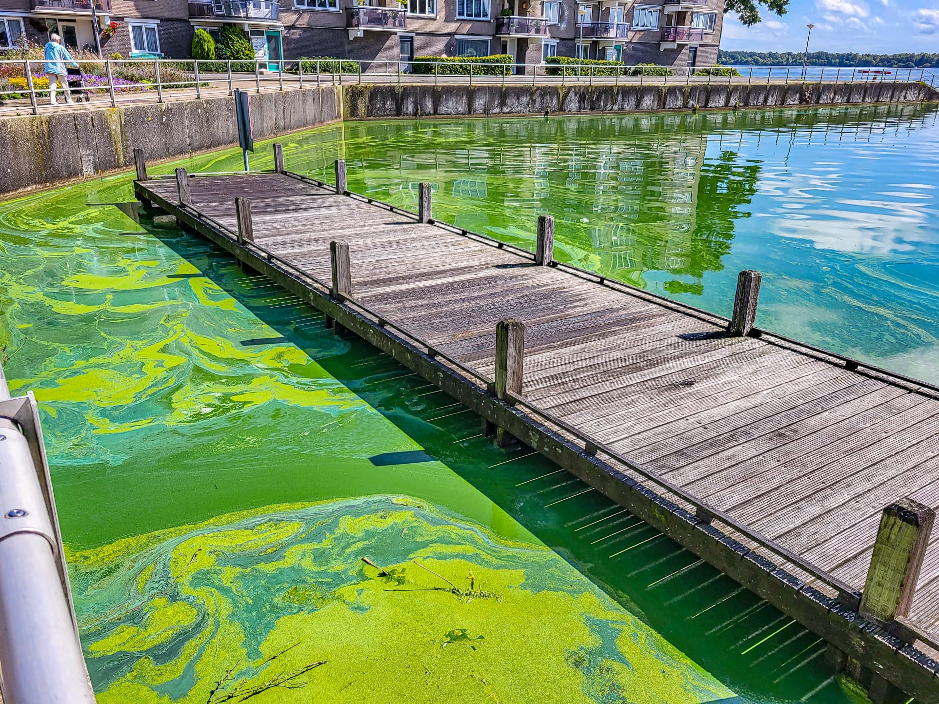 “De foto’s zijn gemaakt vanuit de wijk Hoornse Meer, vanaf de Gasthuiskade”, vertelt nieuwsfotograaf Mike Weening. “Het water op deze plek kleurt groen en geel van de blauwalg.” De website zwemwater.nl waarschuwt sinds vrijdag voor blauwalgen in het Paterswoldsemeer. Voor het meer geldt niet een negatief zwemadvies maar wel een waarschuwing. Zwemmen in water met blauwalg kan leiden tot huidirritatie en maag- en darmklachten.
