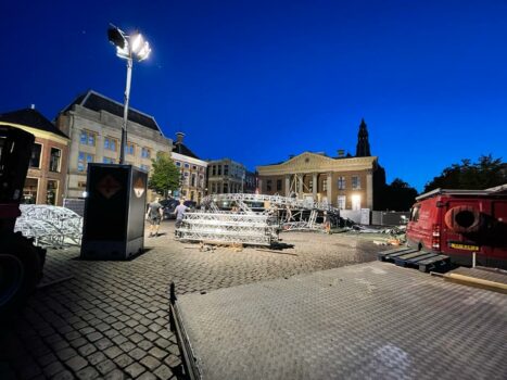 De opbouw van het podium waar The Grand Opening plaatsvindt, begon zaterdag. Foto: Rieks Oijnhausen
