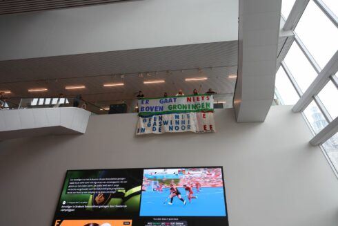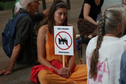 “Rond 14.00 uur is de groep het gebouw van Forum Groningen binnengelopen”, vertelt een nieuwsfotograaf. “Daarbij werd een spandoek opgehangen en zijn de mensen op de grond gaan zitten. Ze hebben bordjes bij zich met daarop de tekst ‘Nieuwe gaswinning? Nee, bedankt’. Er vinden toespraken plaats, en de situatie is ontspannen en rustig.”