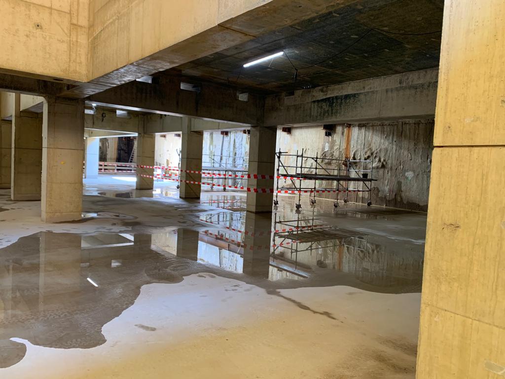 Het storten van beton was een hele klus. “We hebben ruim 2.600 m³ beton gestort. Dit gebeurde onder water, om daarmee een constante druk op de wanden te houden. Duikers controleerden of het beton zich gedroeg zoals het hoorde. Nu alle beton op de juiste plek ligt, moet het uitharden. Daarna wordt de badkuip leeggepompt om er weer een bouwkuip van te maken.” Maar het is niet het enige waar aan gewerkt wordt. Even verderop is de bouw begonnen van het verblijf voor buschauffeurs. “In deze ruimte kunnen chauffeurs straks pauzeren. Ook komt er een ruimte waar overlegd kan worden, en er komt een technische ruime waar transformatoren komen te staan die het gehele station straks van stroom gaan voorzien.” Het buschauffeursverblijf krijgt een gele gloed, die vergelijkbaar is met de gele steentjes die in de binnenstad zijn te vinden.