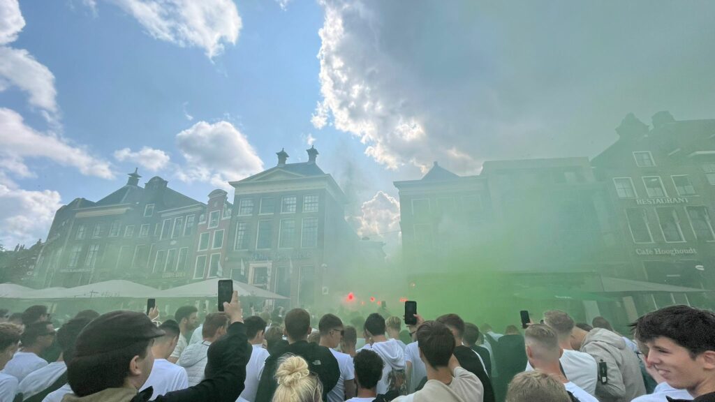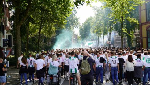 De corteo begon rond 12.00 uur op de Grote Markt, waarna men richting de Euroborg liep. De corteo ging gepaard met gezang, getrommel, vlaggen en groene rook. “Dat zoiets plaatsvindt is best wel uniek”, duidt OOG-verslaggever Maarten Siepel. “In het verleden werden corteo’s vaak gehouden voorafgaand aan de uitwedstrijd tegen SC Heerenveen, de Derby van het Noorden. Wat je vanmiddag in de binnenstad zag, gebeurt niet ieder seizoen. Dus best wel uniek dus.”