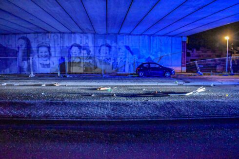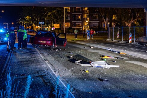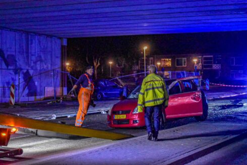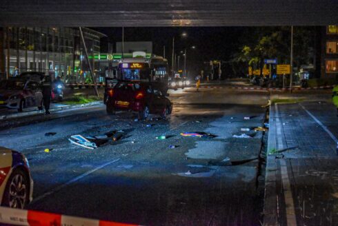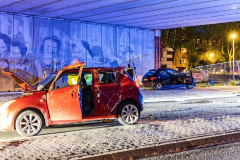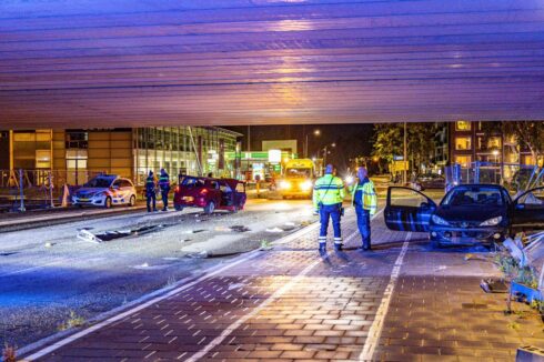 Het ongeluk gebeurde rond 21.20 uur ter hoogte van de kruising met de Muntinglaan. “Het is gebeurd onder het viaduct”, vertelt Ten Cate. “Eén van de voertuigen staat op de middengeleider, de andere auto is tegen een aantal hekken tot stilstand gekomen. Een verkeerspaal ligt omver en glas en persoonlijke spullen liggen op straat. De rode auto heeft schade aan de bestuurderszijkant, de andere auto is beschadigd aan de voorkant. Het is onduidelijk hoe het ongeluk heeft kunnen ontstaan.”