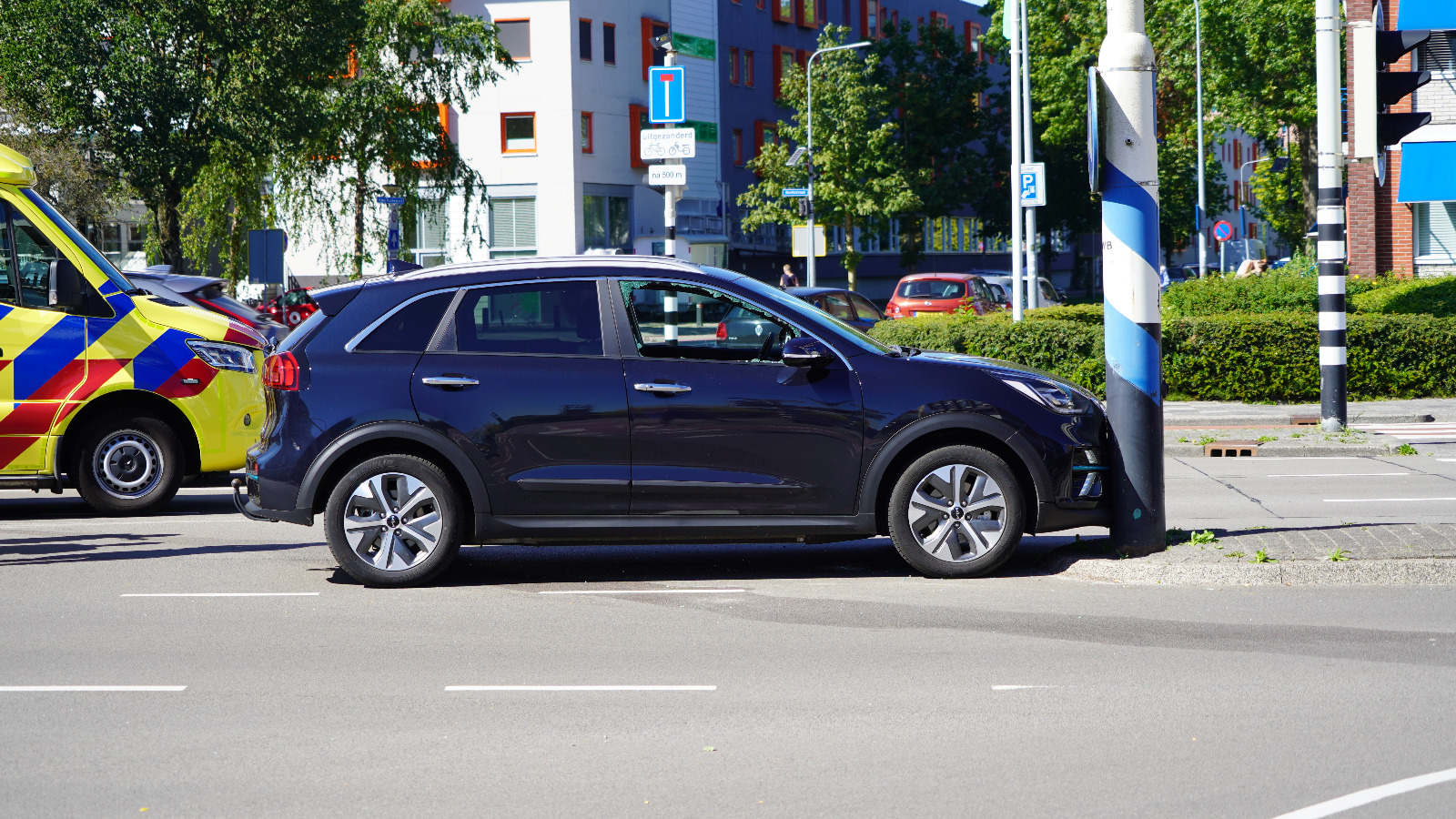 Een personenauto is donderdagmiddag tegen een lantaarnpaal gereden. Dat gebeurde op de kruising van de Paterswoldseweg en het Overwinningsplein.