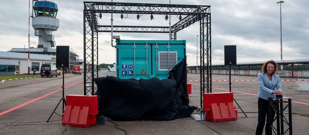Op Groningen Airport Eelde (GAE) werd vrijdagmiddag een demonstratiemodel onthuld van een decentrale electrolysemachine. Een opgeschaald model van dit apparaat moet in de toekomst vliegtuigen, drones en voertuigen op de luchthaven gaan voorzien van waterstof.