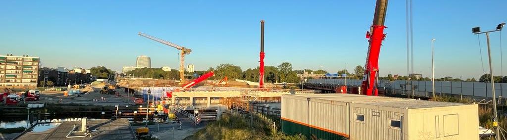 Drie grote hijskranen staan donderdagavond klaar langs de Brailleweg om te beginnen aan een zware klus. Donderdagnacht begint aannemerscombinatie Herepoort aan het leggen van liggers voor de nieuwe Julianabrug. Kort na 22.00 uur lag de eerste op zijn plek.