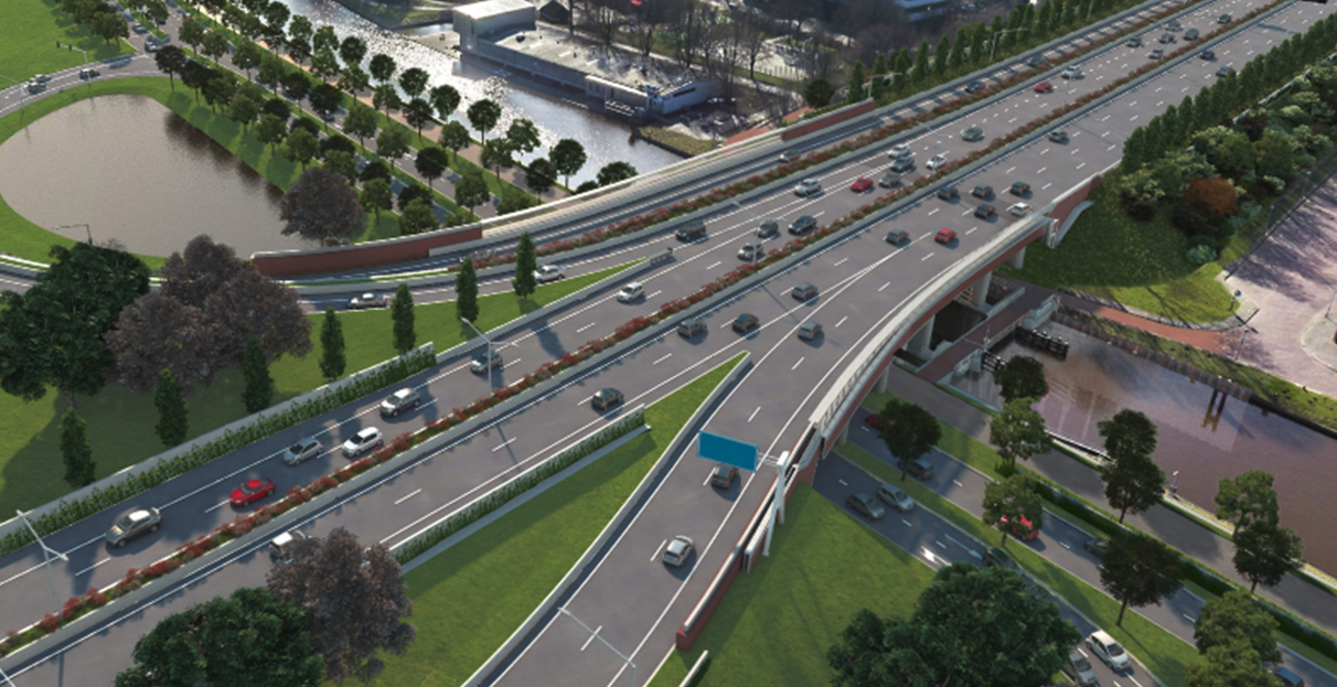 Een impressie van de nieuwe Julianabrug, met aan de zijkanten de rode sierstrips - Impressie via Groningen Bereikbaar