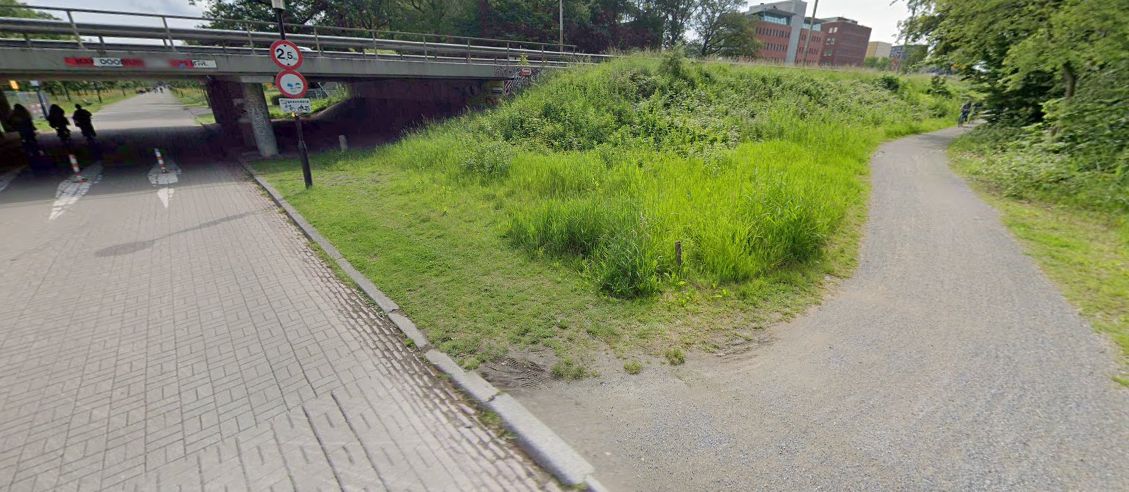 Het tijdelijke fietspad langs de Drafbaan werd drie jaar geleden aangelegd als vervanging voor het fietstunneltje tussen MartiniPlaza en het Gasuniegebouw.