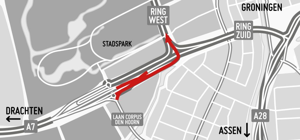 Van zondag 1 oktober 22.00 uur tot maandag 6 november 06.00 uur kan het verkeer vanuit Drachten en vanaf de Laan Corpus den Hoorn geen gebruikmaken van de verbinding naar Ring West. Ook de toerit vanaf de rotondes bij het Stadspark naar het Julianaplein is dicht.