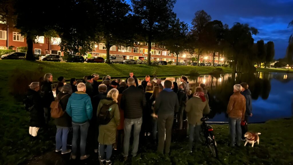 “We hadden zowel een actief als informatief programma bedacht”, vertelt Mathilde Boersema van de organisatie. “Ongeveer vijftig mensen hebben een wandeling gemaakt. Toen het begon te schemeren verzamelde men zich bij de Oosterkerk aan de E. Thomassen à Thuessinklaan. Wijkbewoner Frans Geubel nam de mensen mee op een verrassende wandeling door de wijk.”