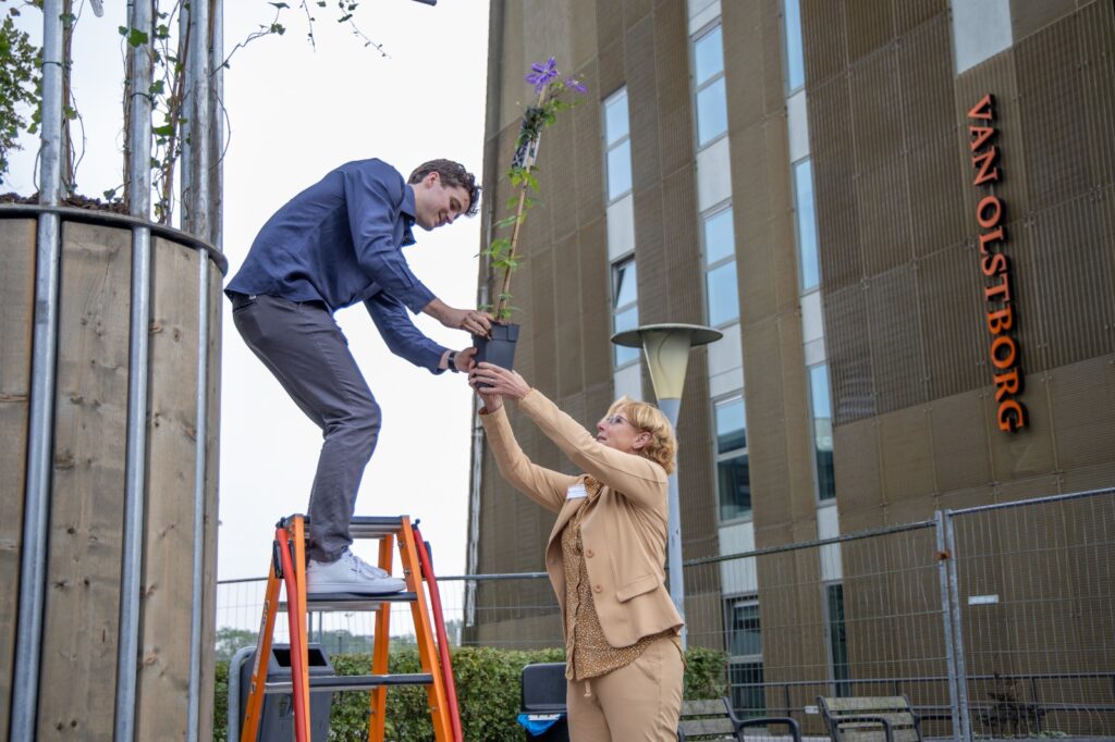 De eerste Klimaatboom is een feit. Deze dinsdag, de Dag van de Duurzaamheid, werd de boom feestelijk onthuld bij de hoofdingang van de Van OlstBorg op de Zernike Campus.