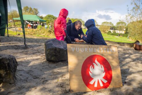 “Vanochtend toen we wilden beginnen hadden we een dikke hagelbui. En dan denk je wel even, oh jee, als er maar mensen komen. Maar, een boswachter laat zich niet kennen. Je bent niet boswachter als het mooi weer is, je bent 365 dagen per jaar boswachter. We hadden deelnemers ook opgeroepen om in oude kleren te komen. Uiteindelijk is ook iedereen smerig naar huis gegaan. Eén van de onderdelen was om van de modderglijbaan naar beneden te roetsjen, als een soort proeve van vakbekwaamheid. Een ander onderdeel was om een vlot te bouwen, waarmee water overgestoken kon worden. Niet iedereen heeft droog de overkant gehaald. Is dat erg? Nee. Dat hoort er bij.”