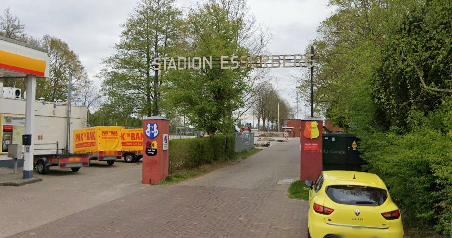 De logo's van Be Quick en VV Helpman bij de ingang van Sportpark de Esserberg - Foto via Google Maps Streetview