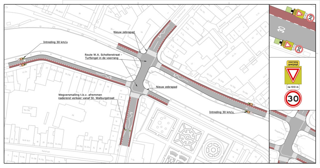 De stoplichten gaan ergens deze week permanent uit. Ook gaat de maximumsnelheid rond de kruising terug naar dertig kilometer per uur, er komen drie nieuwe zebrapaden en de voorrangssituatie wordt aangepast. Op de onderstaande kaart is te zien wat deze verandering betekent.
