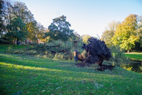 Een treurwilg in het Noorderplantsoen heeft de eerste herfststorm van dit jaar niet overleefd. Niemand is gewond geraakt.