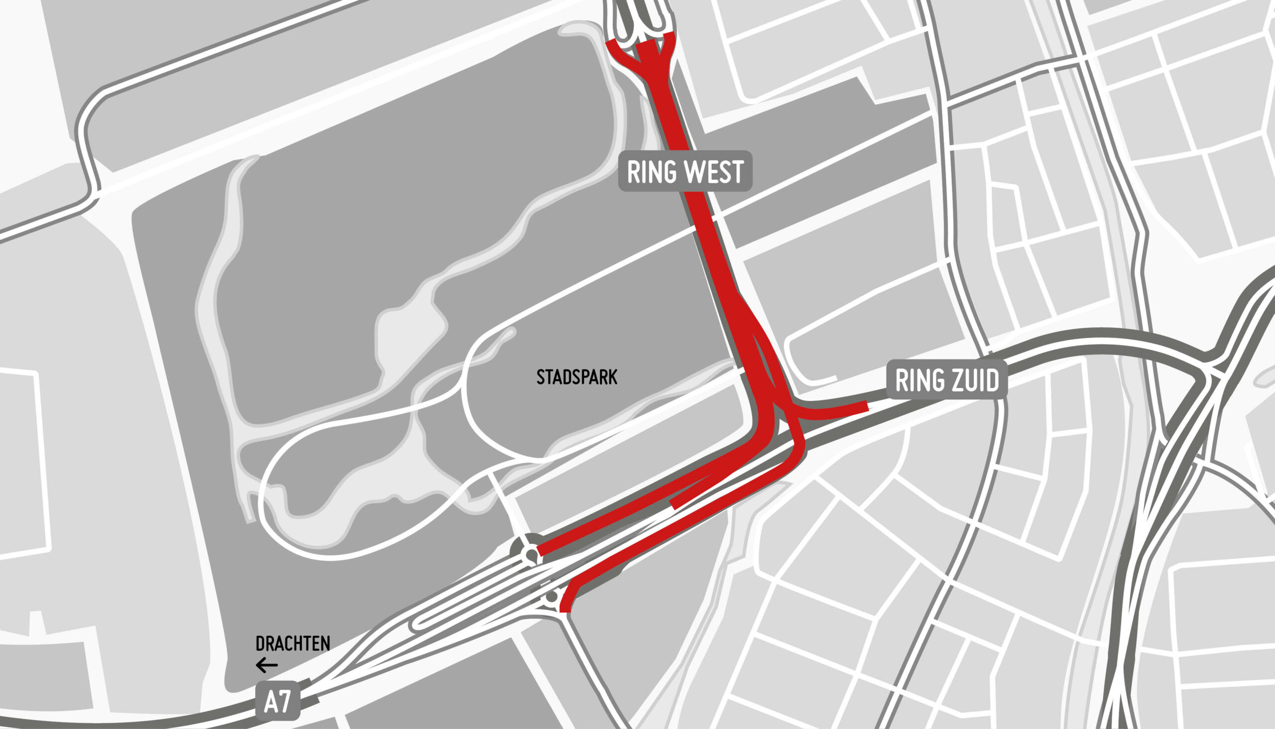 De ringweg is in beide richtingen afgesloten tussen de op- en afritten naar de Zeeheldenbuurt en het Vrijheidsplein, inclusief de aansluiting tussen de rotondes bij de Laan Corpus den Hoorn en de zuidelijke ringweg.