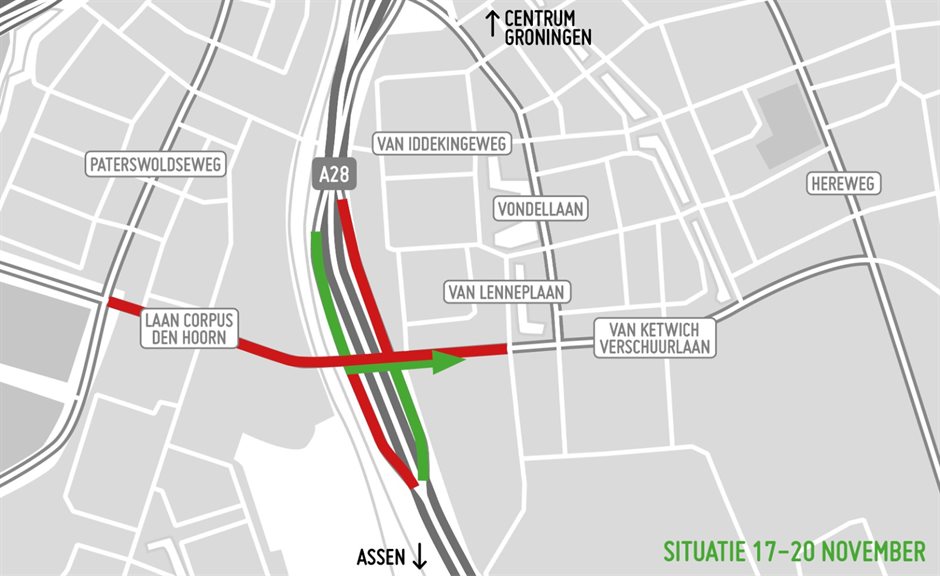 Momenteel is het dus niet mogelijk om van de Van Ketwich Verschuurlaan naar de Laan Corpus den Hoorn te rijden. Tegelijkertijd zijn beide opritten van Groningen-Zuid dicht. De afritten zijn wel te bereiken, maar het verkeer kan alleen rijden in de richting van de Van Ketwich Verschuurlaan.