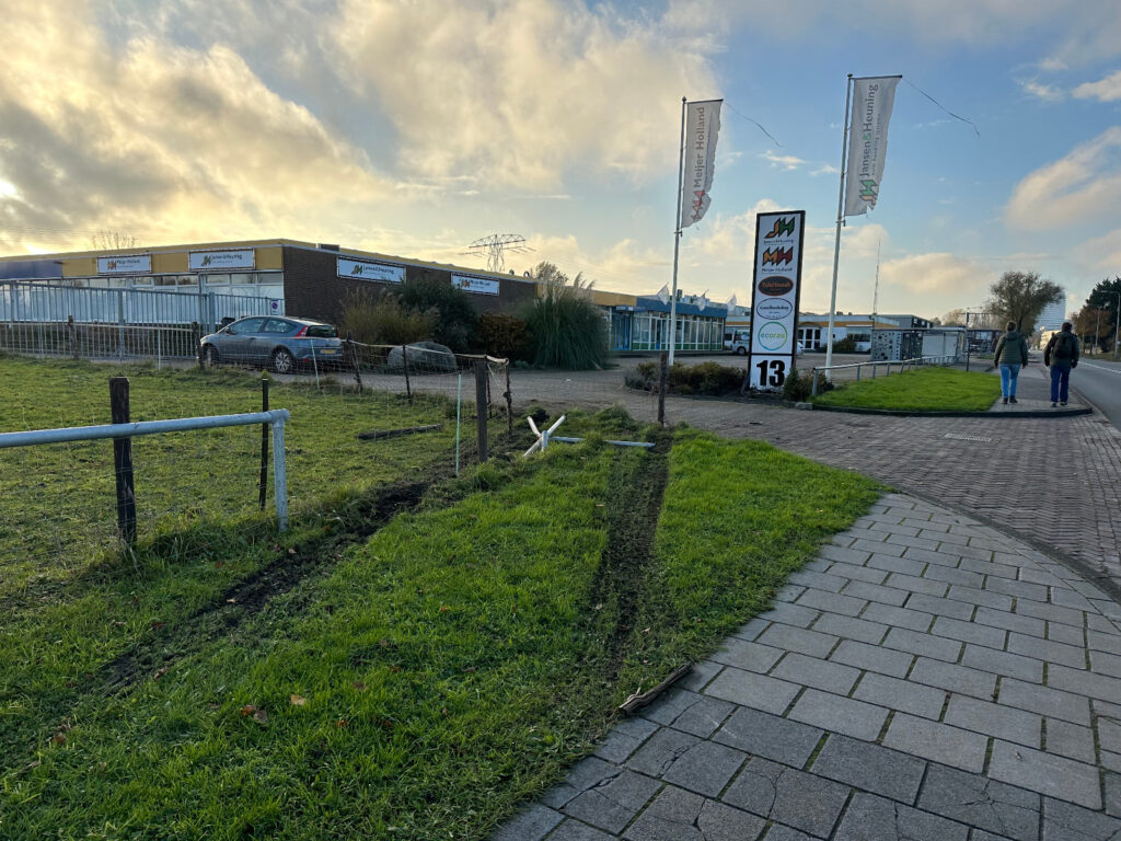 Joep Lommerts, eigenaar van meubelmakerij Tafelsmaak, vertelt over de opvallende actie van zondagochtend: “Zoals je ziet op de beelden maakt de auto die rond 06.05 uur door de straat reed ineens een flinke ruk naar links en belandt in het hekwerk. De auto probeerde weg te komen en dat lukte wonderwel, door tussen een reclamebord en een vlaggenmast door te rijden.”