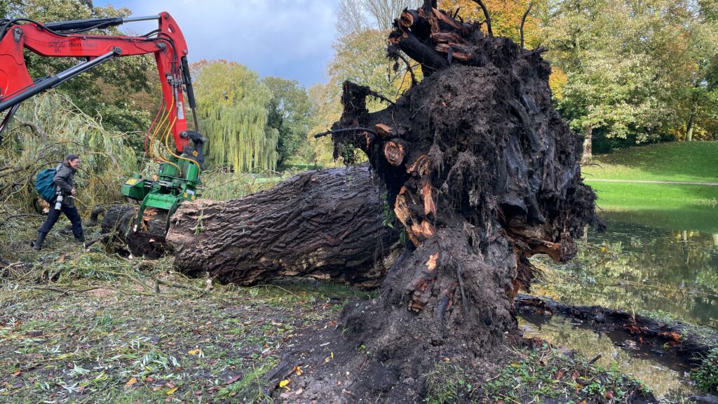 ‘Ik fietste daar langs en dacht, dat kan echt niet. Toevallig zou ik op dat moment met RTV Noord iets opnemen in het veld. Toen heb ik dat omgegooid. Ik zei, kom maar hierheen. Toen ben ik naar de werkmensen toegelopen met de vraag: gaan jullie alles weghalen of blijft de stam liggen? Want dat zou heel mooi zijn. Toen zeiden ze, ja helaas gaat alles weg. Het zou allemaal versnipperd worden voor de bio brandstof. De hele herinnering aan zo’n boom is dan weg. Dat de boom daar nu ligt, doorbreekt het patroon van een net aangeharkt park.’