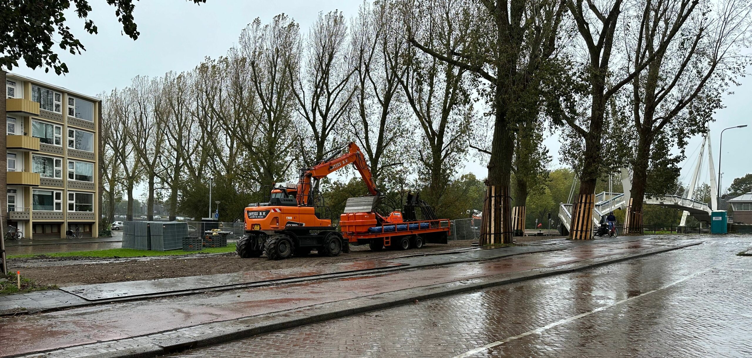 Een aannemer is maandag begonnen met het plaatsen van schroefpalen aan de ‘stadskant’ van de Gerrit Krolbrug. De palen zijn nodig voor de fundering van de tijdelijke hellingbanen voor fietsers en voetgangers, die hier vanaf 20 november worden aangelegd.