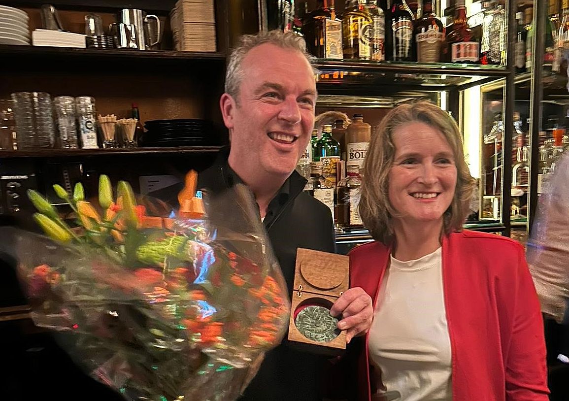 Eigenaar Arnold Ensing nam zondag de Erepenning van de gemeente Groningen in ontvangst. Wethouder Economische Zaken Carine Bloemhoff reikte de erkenning uit ter gelegenheid van het 100-jarig bestaan van het café.