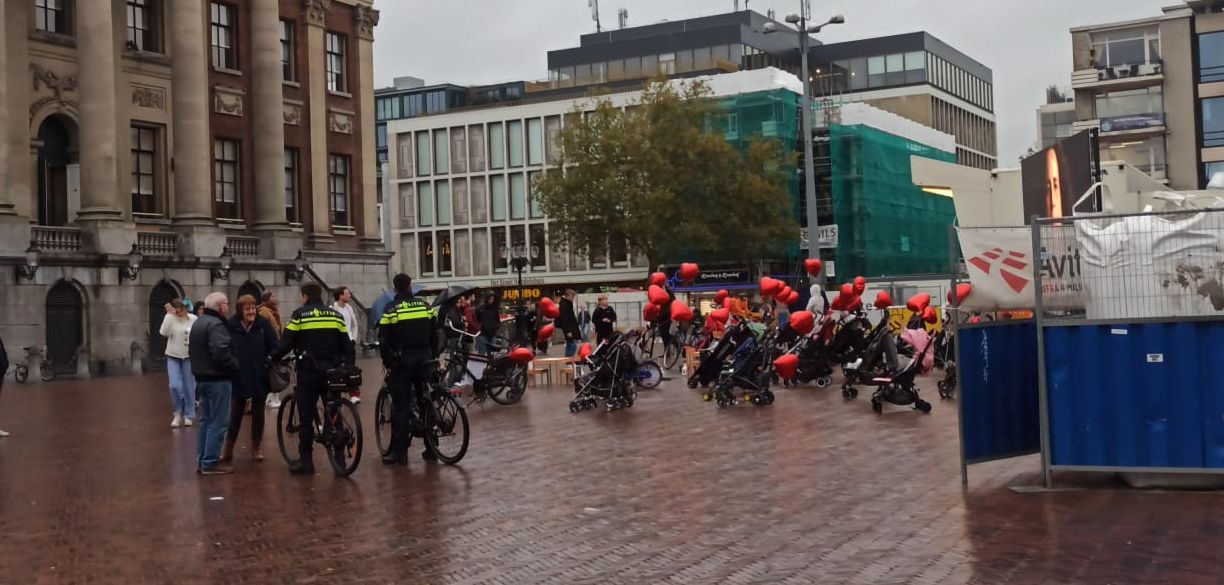 Op de Grote Markt stonden vrijdagochtend zo’n vijftien lege kinderwagens, kinderfietsen en schoolbankjes. Daarmee werd aandacht gevraagd voor kinderen uit Israël, die door Hamas zijn gegijzeld.