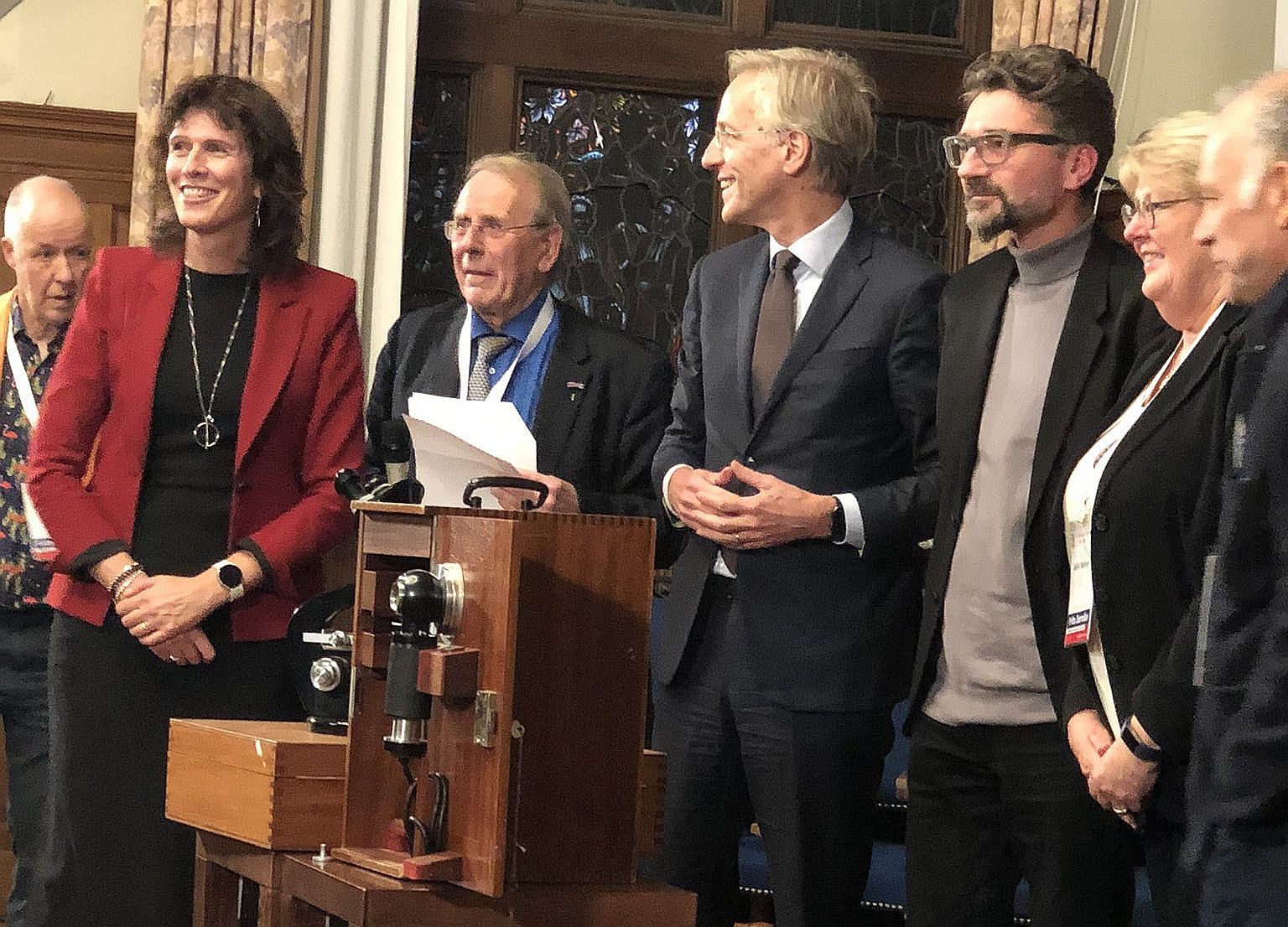 Frits Zernike kleinzoon van de gelijknamige Groninger wetenschapper en Nobelprijswinnaar, schonk vrijdagavond een microscoop uit het familiearchief aan het Universiteitsmuseum. Demissionair minister Dijkgraaf nam de microscoop officieel in ontvangst in het Academiegebouw.